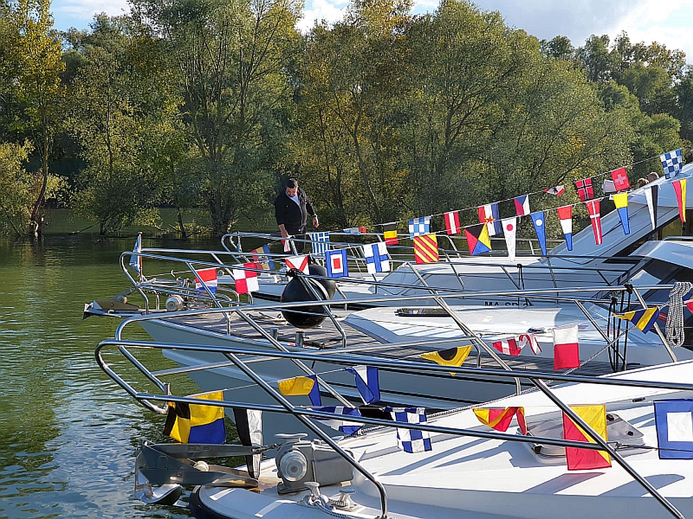 Wie so oft hängt der Erfolg einer Veranstaltung vom Wetter ab. Und dieses Mal hat es geklappt. Eine Frühlingsluft wie Samt und Seide vertrieb die saharasandige Wetterlage und lockte zahlreiche Mitglieder zur traditionellen Flaggenparade. Unser leider fußkranker, auf Krücken gestützter erster Vorsitzender Matthias schwor das illustre Schmölzche mit lockeren Worten auf die kommende Saison ein und gab dann den lang ersehnten Befehl: "Heißt Flagge" (das ist kein Schreibfehler, das heißt wirklich so). Dieser wurde nach einer kurzen Verzögerung, wegen Flaggenwulings, ausgeführt. Im Anschluss tuckerten die über die Toppen geflaggten Boote zur Nordspitz, dort kurz Päckchen bilden, auf Neptun anstoßen und in die Kandel zurücktuckern. Am Abend gut bürgerliches, kulinarischen Verwöhnprogramm in der Altrheinschänke. Rundum eine launige Saisoneröffnung.
