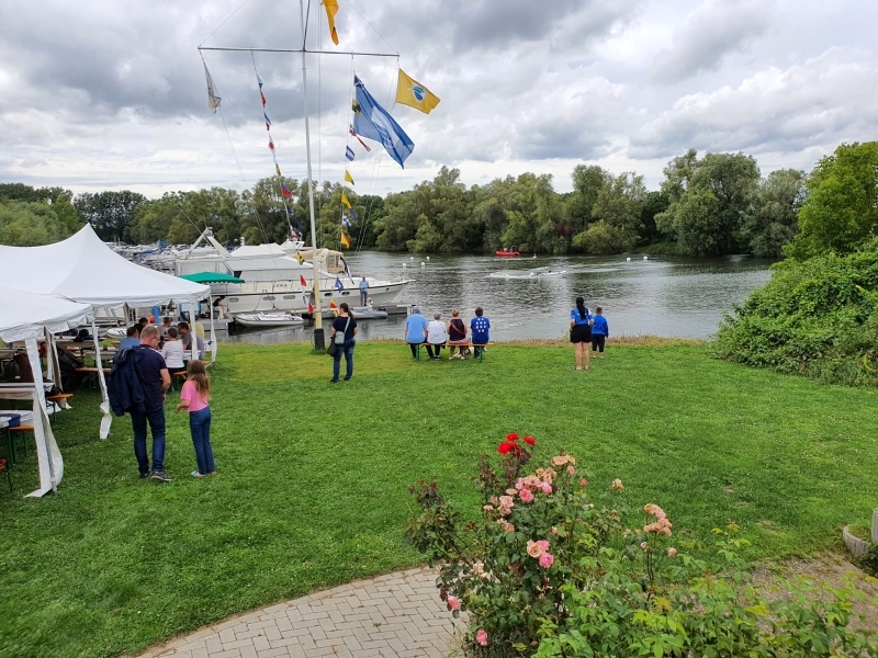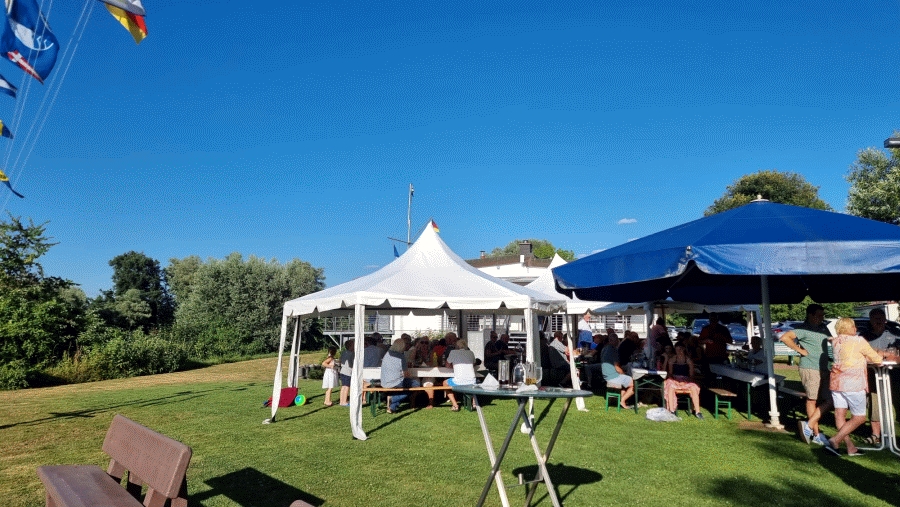 Für das am 6. Juli anstehende Kandelfest hatten sich mehr als 80 Teilnehmer angemeldet. Aufgrund des angesagten unbeständigen Wetters und der nach wie vor äußerst lästigen und aggressiven Schnaken fand sich anfangs nur eine kleinere Gruppe auf der Festwiese ein. Gegen Abend waren sie dann alle da und wurden durch eine trinkfreudige Abordnung des benachbarten Yachtclub Erfelden verstärkt. Zumindest der Wettergott hatte ein Einsehen und bescherte lediglich am frühen Nachmittag ein paar bescheidene Regentropfen, die weder die Clubmeisterschaft der Schlauchbootjugend noch die Laune der Festteilnehmer entscheidend beeinträchtigen konnten.